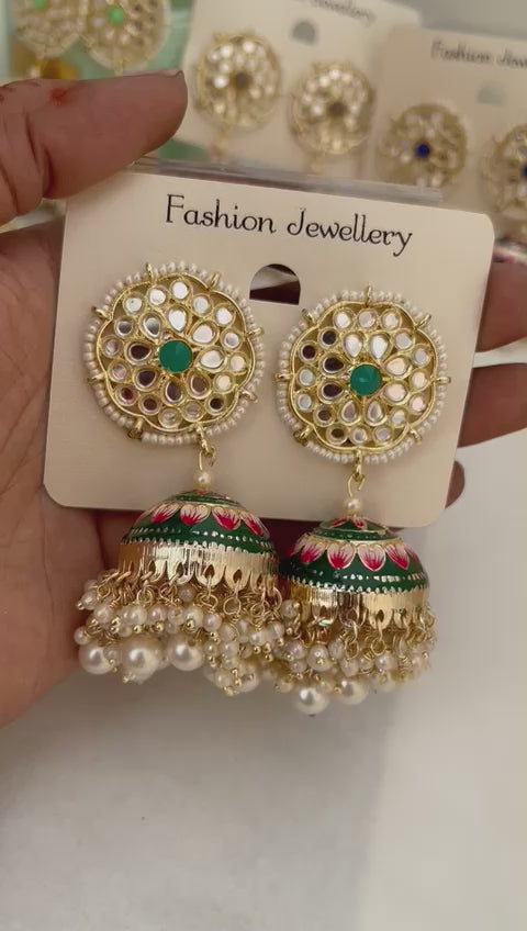 Latest Kundan Jhumkis With Beautiful Powder Color Beads E-25