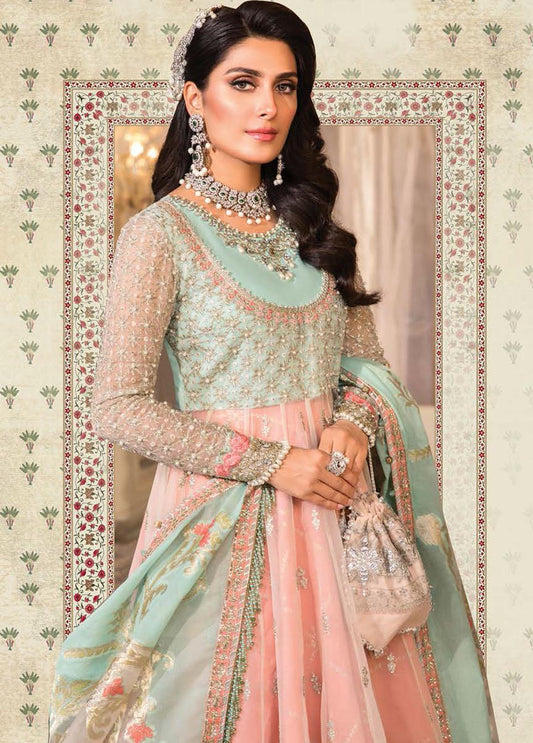 Mbroidered By Maria B Embroidered Raw Silk Aqua and Salmon pink Suit Unstitched 3 Piece D2 - Wedding Collection